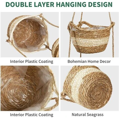 2 Size Seagrass Hanging Planter Basket perfect for planting outdoor plants and flowers. inside and out outdoors, and can also be used for storing makeup brushes, lotions, toiletries, kitchen utensils or any other items that need to be stored.